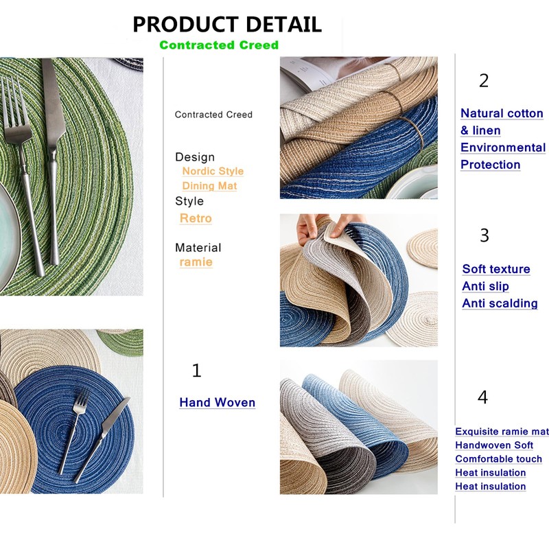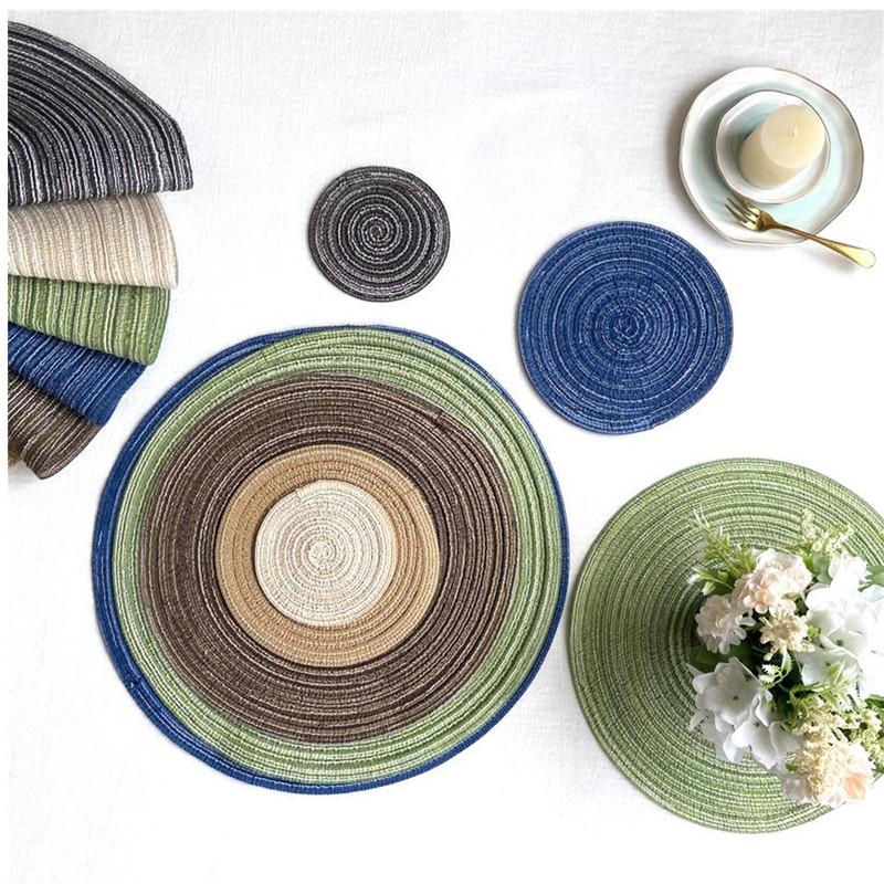 - Natural materials braided coasters or coffee mat placemats set washable non-slip round table mats for kitchen dining table European style, round indoor hand woven fabric table mats made of ramie, polypropylene and cotton