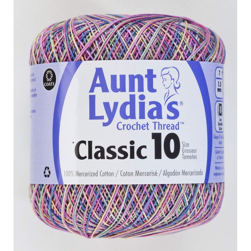 Aunt Lydia's Crochet Cotton. This high luster mercerized cotton crochet thread is perfect for crochet projects both large and small. This thread is available in a wide range of fashion solids neutral basics and alluring multi-colors that are ideal for home decorating and fashion projects. Article 154 is a size 10 bedspread weight 3ply 100% mercerized cotton thread. White and Ecru: 400yd/365.75m Solids: 350yd/320m and Shaded Colors: 300yd/274.3. Size 7/1.5mm crochet hook is recommended. Care: machine wash (. 104F/40C) dry flat do not bleach do not dry clean OK to iron. Imported.