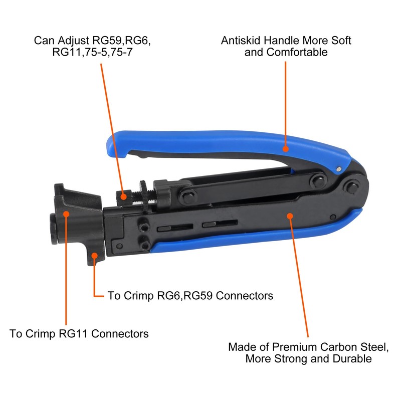 • The coax crimper is very practical crimping tool that can adjust F-screw head and compass F connectors/Coaxial cable connector: It can crimp rg6, rg59, rg11, and compress 75-5-7 kinds of Metric and Imperial F-Head. Anti-skid handle, more soft and comfortable
