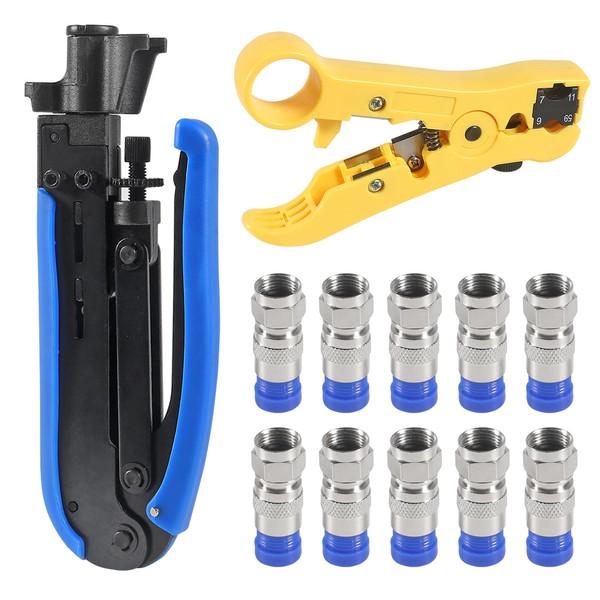 Coaxial Compression Tool Coax Cable Crimper Kit Adjustable RG6 RG59 RG11 75-5 75-7 Coaxial Cable Stripper with 10pcs F Compression Connectors Blue