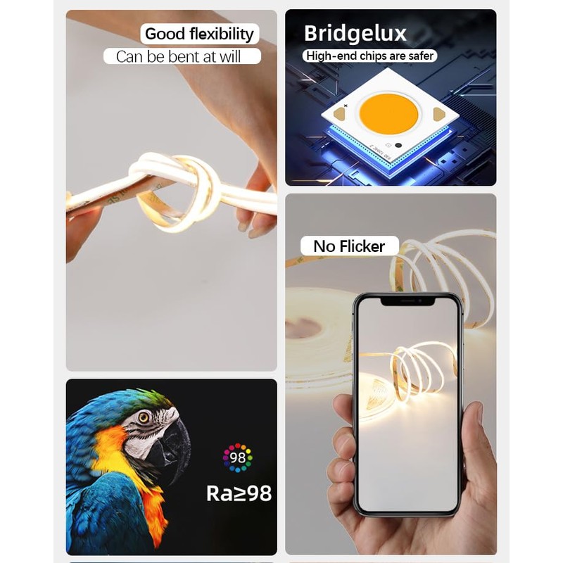 • 【Durable and Widely Used】 With strong double-sided adhesive tape, COB LED strip lights can be attached and installed reliably. 16.4ft/5m in length, very suitable for decoration in kitchen, cabinet, bedroom, stairs, mirror, hallway, DIY backlight, table lamp, toy lamp and other places needed.