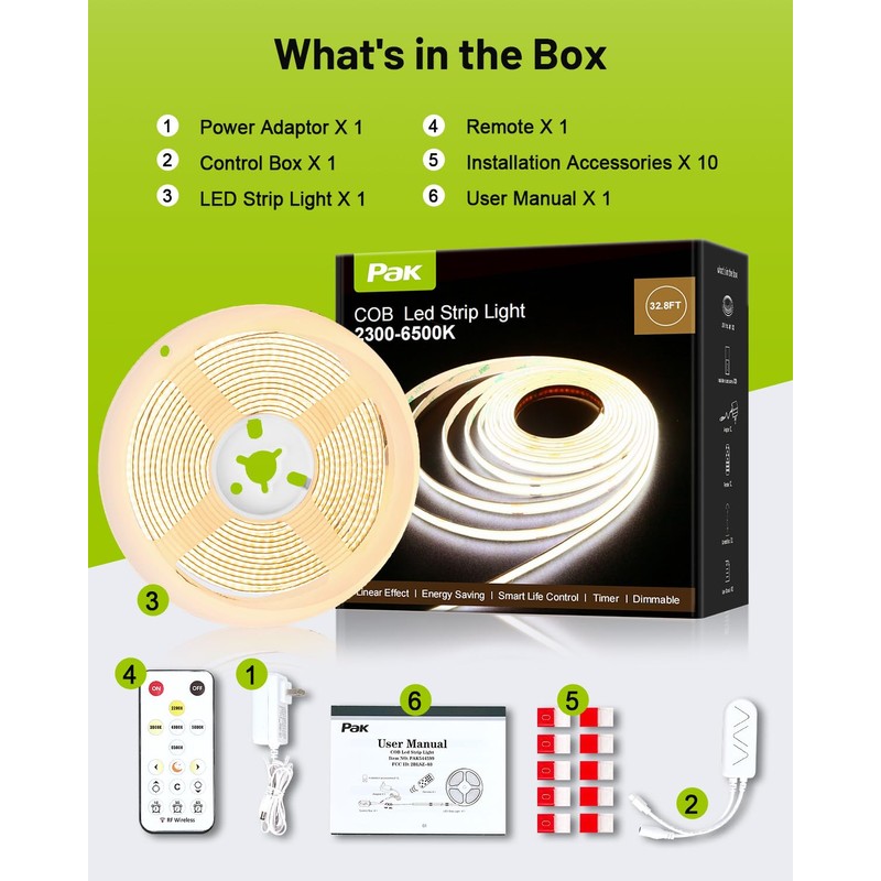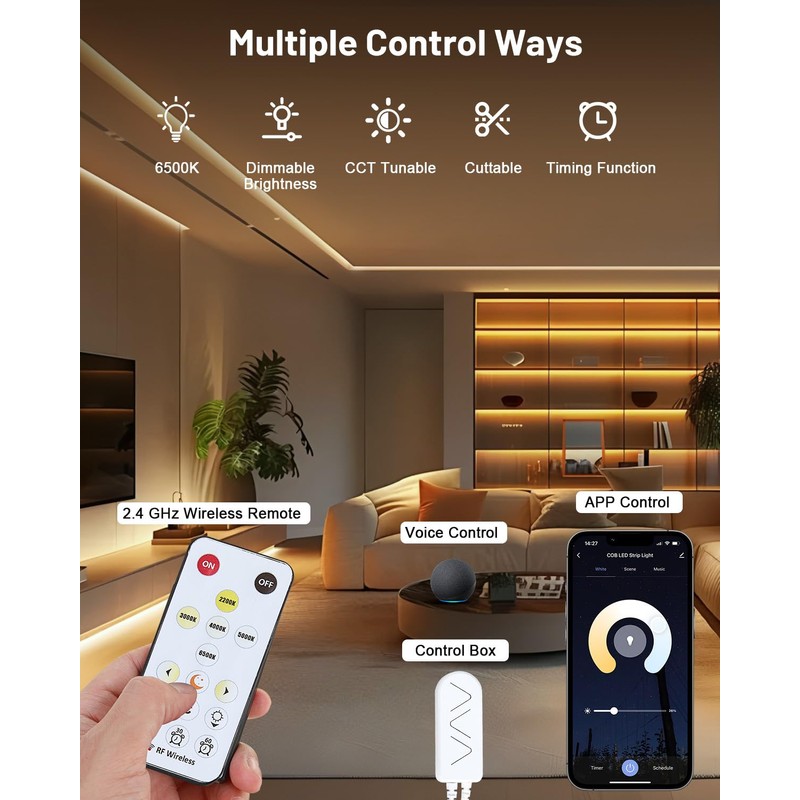 - [Multiple Control Ways]: You can control this versatile COB LED strip light by using Smart Life APP, 2.4 Ghz wireless remote, control box or voice control, easy to turn on the light and set the brightness, color temperature and light mode to create the bright and comfortable lighting effect you need; The light supports voice control with smart assistants like Alexa and Google Assistant for instant, ensuring hands-free operation