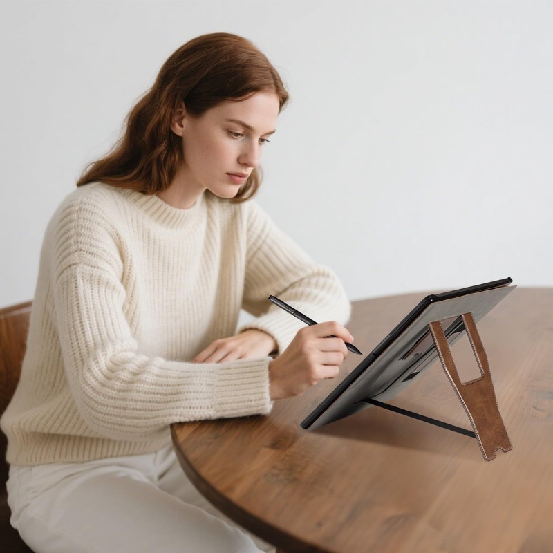• 【Multi-Angle Stand】Foldable stand design with 2 ergonomic angles for comfortable viewing and typing. Elastic hand strap offers a secure, one-handed grip—ideal for reading, commuting, or on-the-go use.