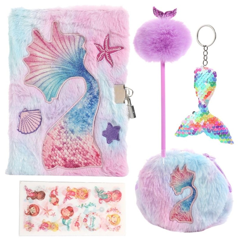 - Fluffy mermaid design diary set with elegant mermaid motif. The 5.5" x 8.2" ruled notebook is keyed to keep your daily events and secrets secure. The fluffy fur cover is comfortable to the touch and the design of the ocean world gives it a special look. It is the perfect item to remember your precious memories