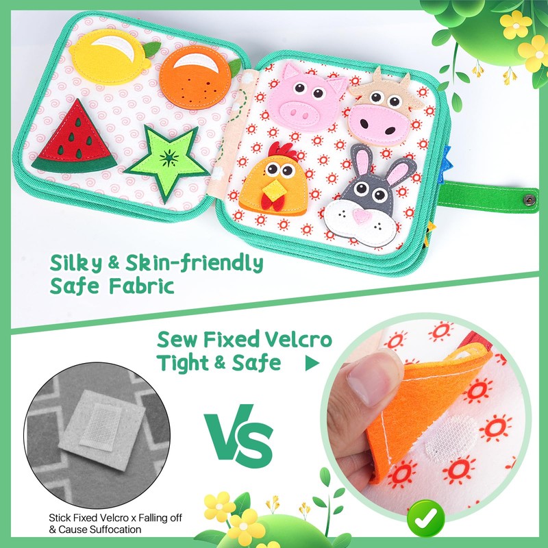 - HIGH QUALITY & SAFE MATERIALS: Made with premium felt fabric, our Busy Book is soft, durable, and perfectly safe for children ages 1+. The sturdy design stands up to active play, and all components are securely stitched to prevent choking hazards. Give parents peace of mind and let little ones explore safely.