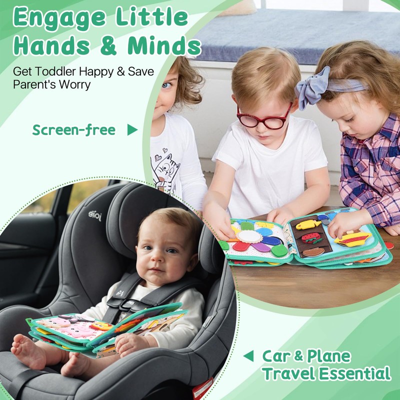 - PERFECT QUIET BOOK & TRAVEL TOY: Lightweight and easy to carry, this quiet book is ideal for car rides, restaurants, or as airplane activities for toddlers 1-3. An excellent choice for parents looking for travel toys for toddlers 1-3 to keep little ones entertained screen-free.