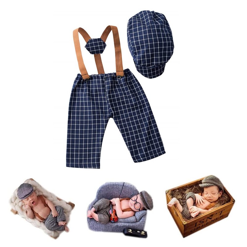 Coberllus Newborn Monthly Baby Photo Props Stripe Cool Boys Cap Pants Photography (Dark Blue)