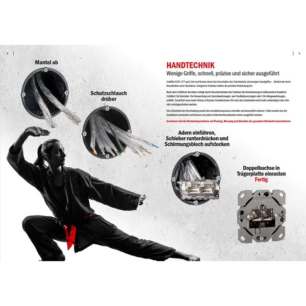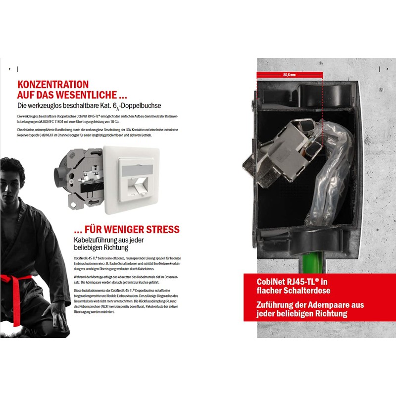 CobiNet RJ45-TL Cat. 6A double socket. The tool-free switchable cat. 6A double socket, unbeatable with bare hands, concentration on the essential... for less stress. Cable supply from any direction. Manual technology. Few handles, fast, precise and safe 1. Coat from 2. Protective hose over it. 3. Insert cores, press down the slider and attach the shielding plate. 4. Snap the double socket into the carrier plate. The best of two technologies. Powerful as a socket module, compact as a data socket. You can rely on the electrical and mechanical performance of the CobiNet RJ45-TL double socket. This has been proven independently and neutrally by a GHMT Type Approval. (Certificate No.: z6486a-21)