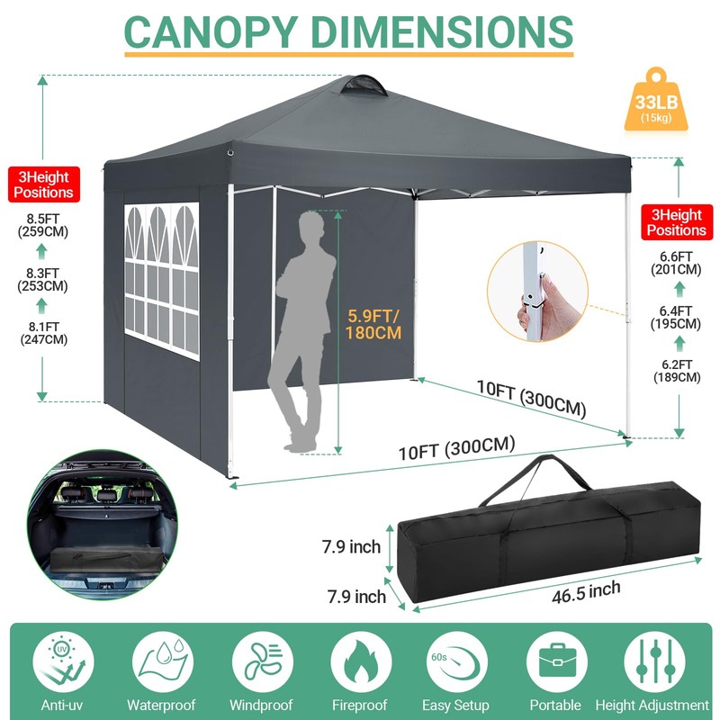 - 【Easy to Assemble & Take Down】Easy to set up with collapsible steel accordion frame and easy to remove. COBIZI canopy tent can be easily set up and disassemble in just five minutes for two person without any additional tools. The dimensions of the waterproof adjustable canopies after assembly are 10'x10' (weighing only 40 pounds). This allows you to easily take it to various locations such as the beach, park, or any place where your fun begins!