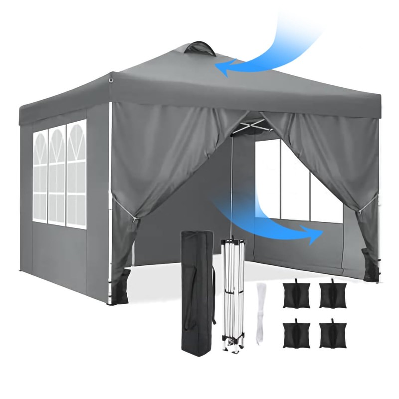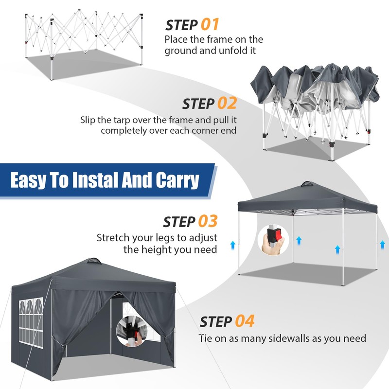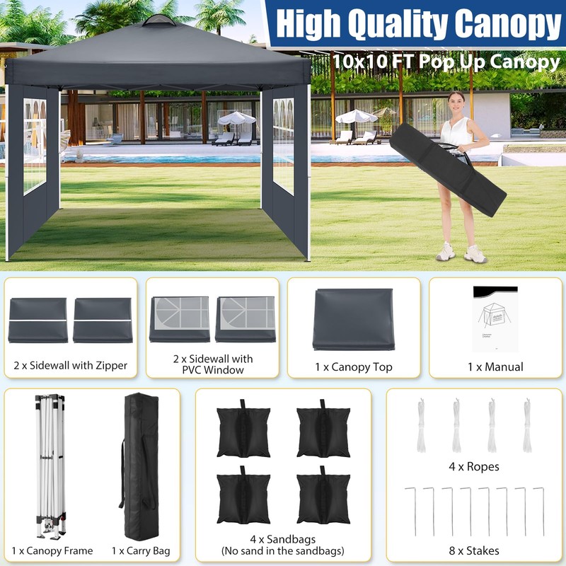 - 【Packing List】 10ft x10ft pop up tent frame + canopy roof+ 4 sidewalls(2 walls have windows+2 walls have zippers)+ 4 x sandbag + carrying bag + 8 x canopy stakes + 4 x rope. These sidewalls are removable, you can choose to set or not for different use. The four sandbags help to anchor the tent to the ground, ensuring that it stays securely in place during use. Hold up well to light wind. All of these items can be put into a carry bag, making it easy to transport and fit into most car trunks.