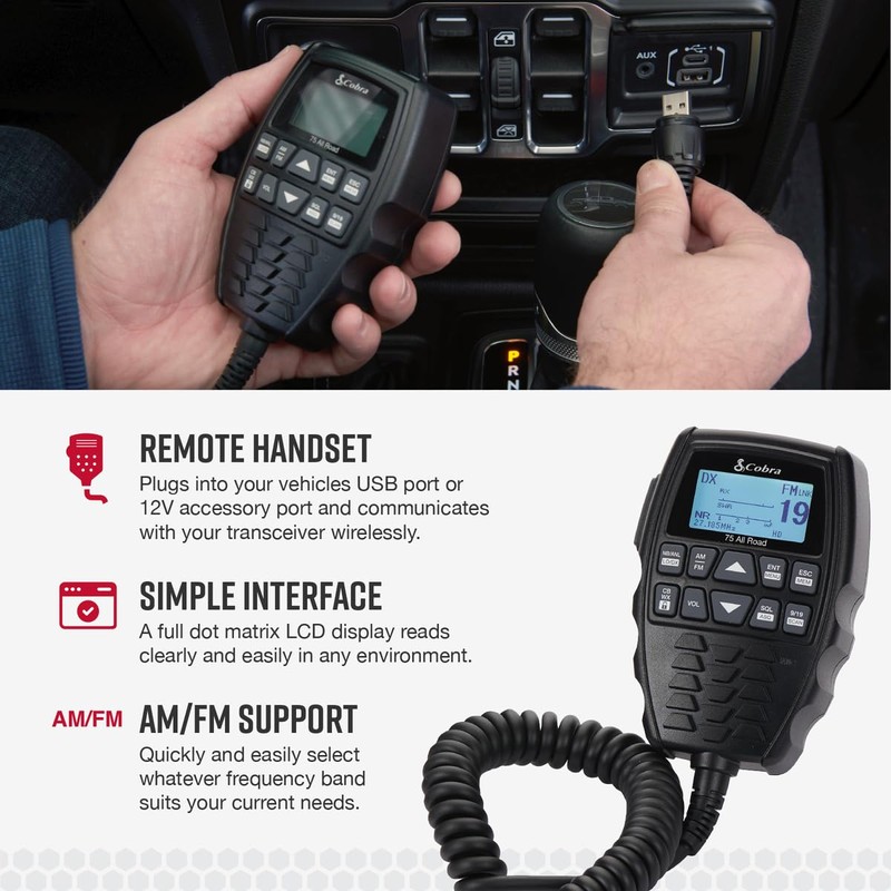 - USB or 12V Power C The 75 All Road CB radio comes equipped with an all-in-one wireless handset that can be easily powered directly from your vehicle's USB port or 12V accessory port.