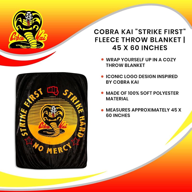 Cobra Kai "Strike First" Oversized Plush Throw Blanket | Cozy Sherpa Cover For Sofa, Bed | Super Soft Fleece Blanket | Official Karate Kid Collectible | 45 x 60 Inches