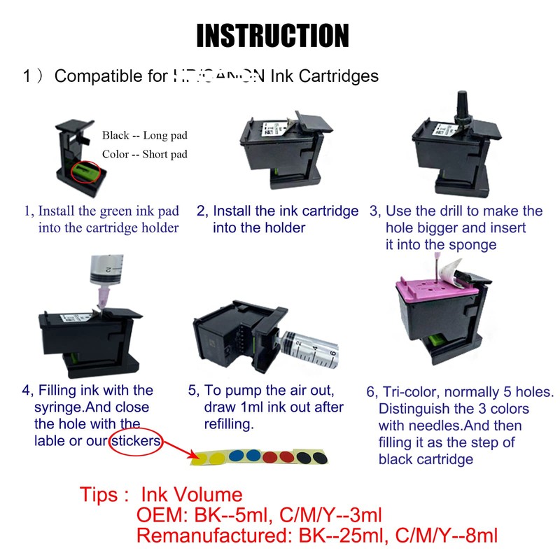 - b)The ink kit include: Black x 200ml (2 bottles) , Cyan x 100ml , Magenta x 100ml, Yellow x 100ml ; Refill Tools x 4sets;Drill x 1pc;Cartridge holder x 1pc; Ink pad x 2 pcs; Gloves x 1 pair;Stickers x some