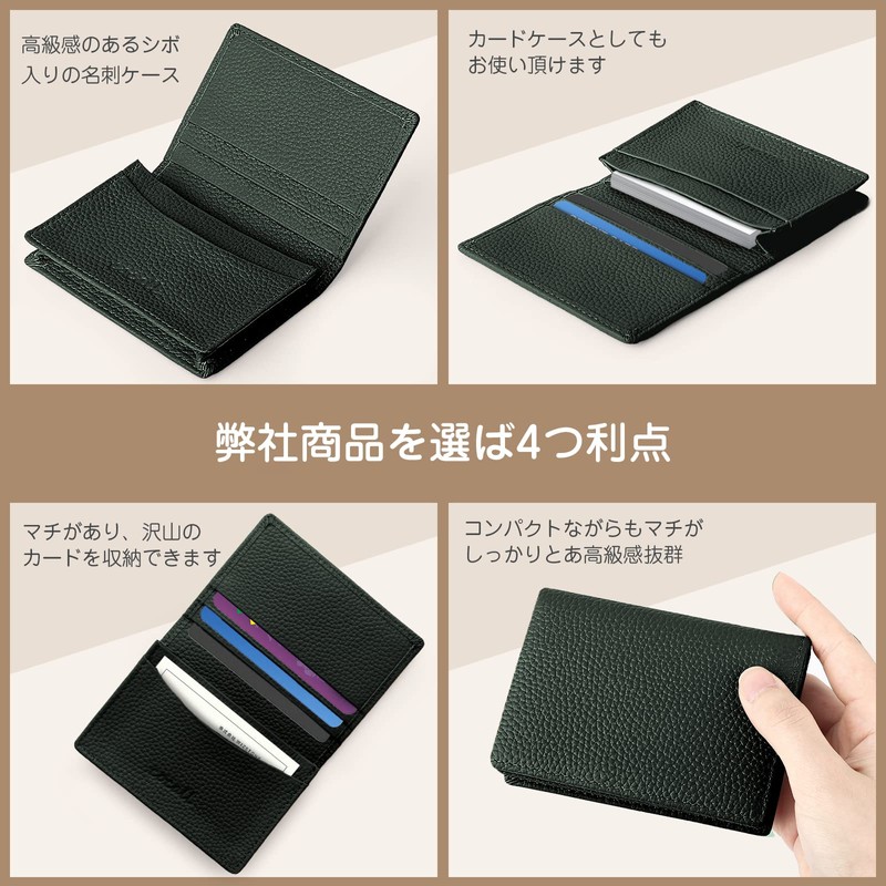 - Business Card Holder Made of High Quality Genuine Leather: This business card case is made of soft and durable genuine leather, and the inside are all identical leather for a beautiful and uniform look. Smooth backing allows for smooth card insertion and removal. In addition to curved pockets, the pockets are designed to be "deep" and "widener". Cards stored outside the curved pocket are not visible, giving a neat and smart impression