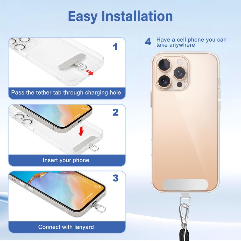 - Easy to Install: Pass the cell phone tether tab through the charging hole of your phone case. Next, insert your cell phone and connect the lanyard. In just a few steps, you will have a cell phone on the go