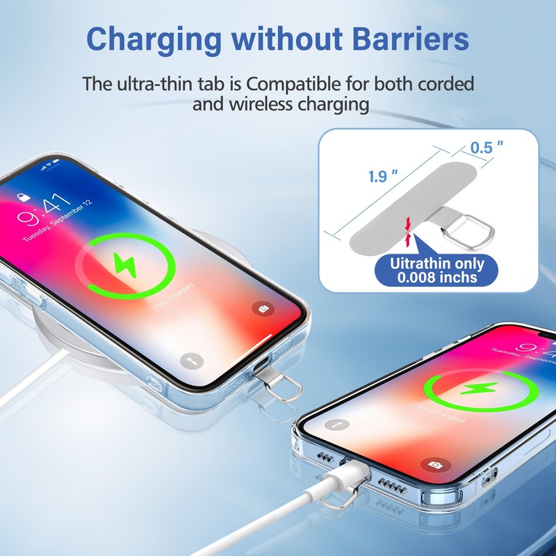 Charging without Barriers: The ultra-thin phone tab of only 0.1cm connects to the lanyard via the charging port. Compatible for both corded and wireless charging without being removed