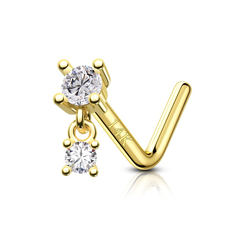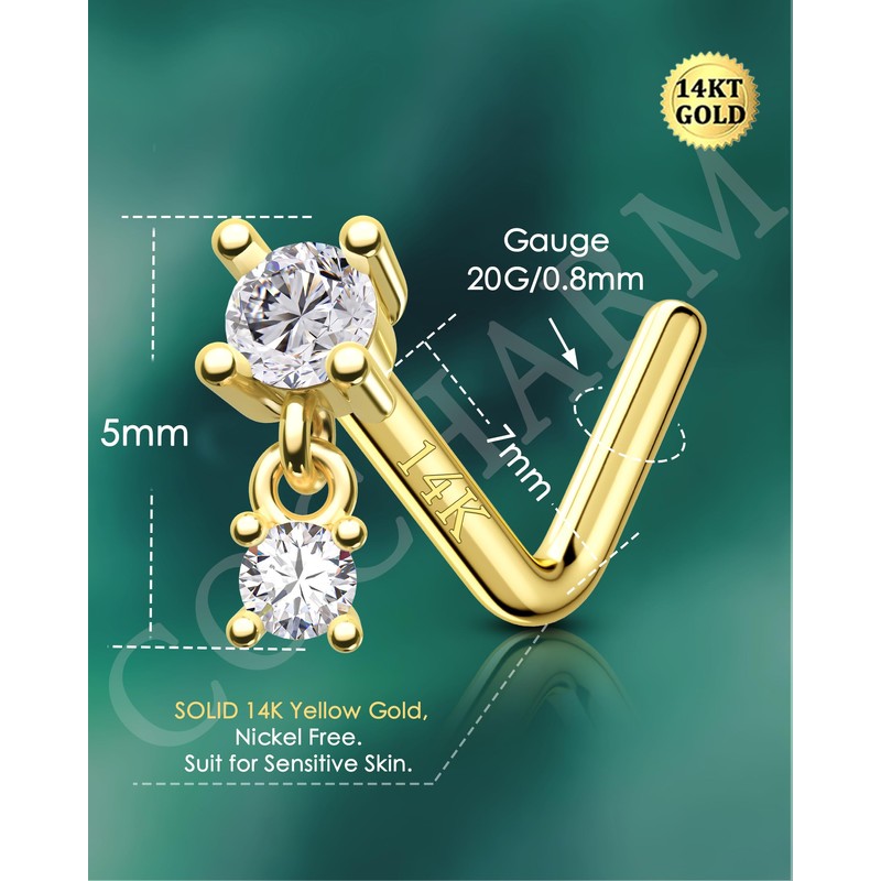 COCHARM 14K Solid Gold Sparkling CZ Dangle Nose Stud 20g Yellow Gold L Bend Nostril Nose Stud 7mm Long Dangling Nose Piercing 14kt Real Gold Nose Stud Nose Ring Press Fit Nose Jewelry