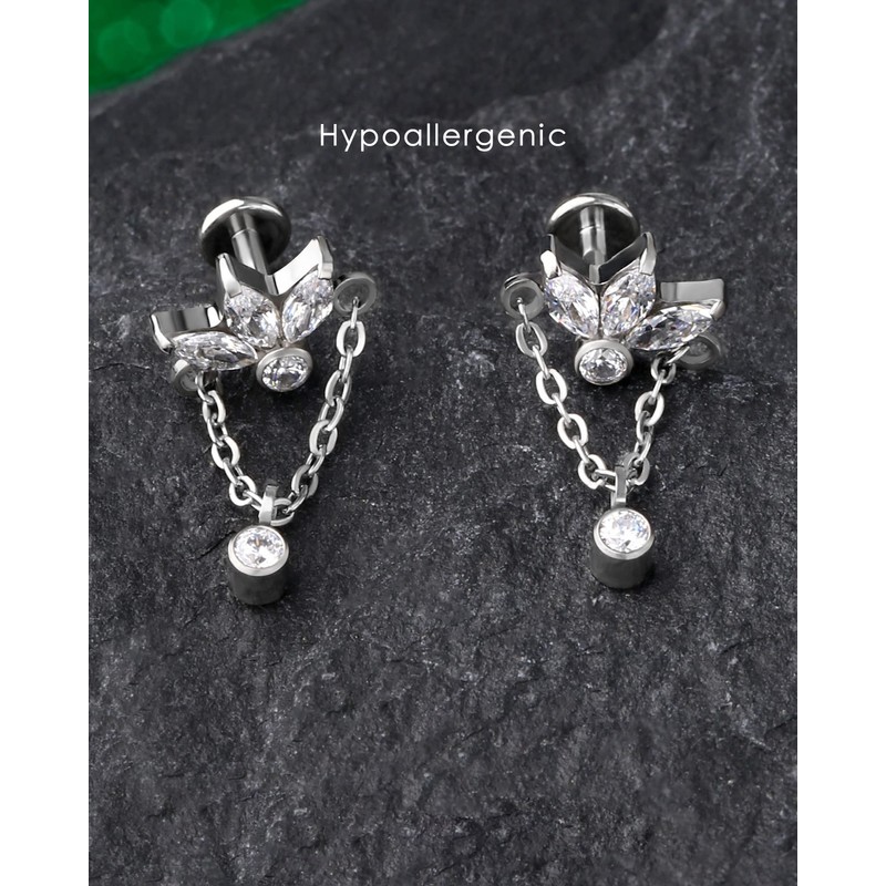 COCHARM G23 Titanium Dangling Chain Helix Earrings Stud 16g Flat Back Flower Upper Ear Stud Piercing 6mm Tragus Earrings 16 Gauge Internally Threaded Forward Helix Stud Jewelry