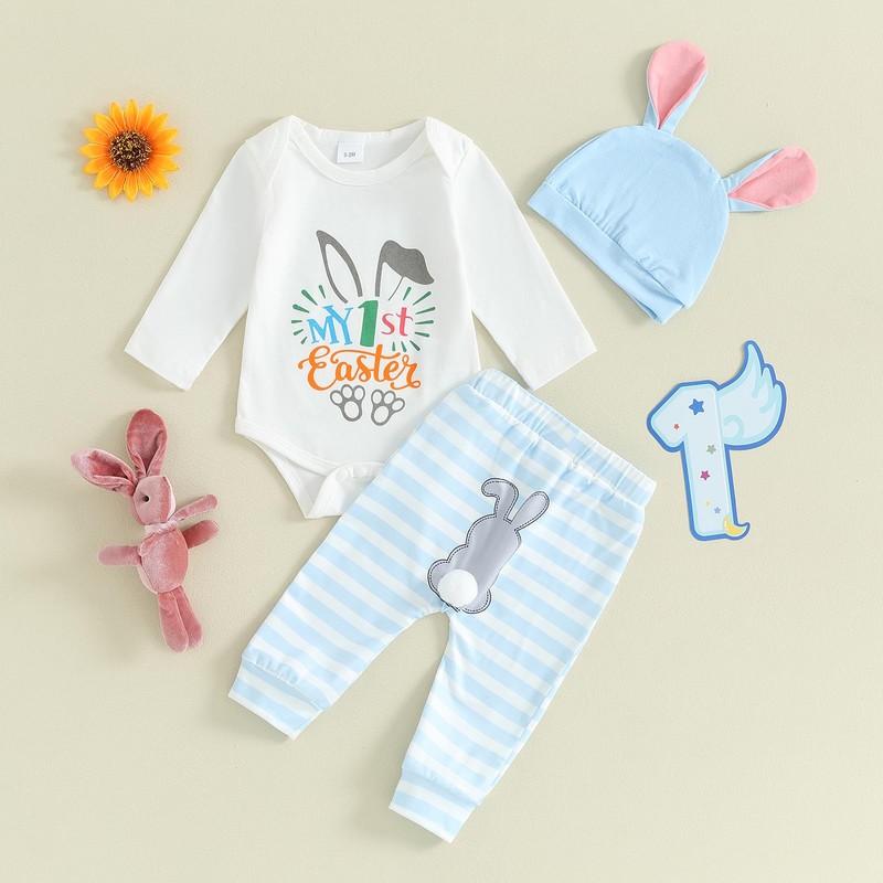 Infant Baby Easter Jumpsuit Set, Letter Rabbit Print Long Sleeve Romper + Stripe Long Pants + Hat for Boys Girls