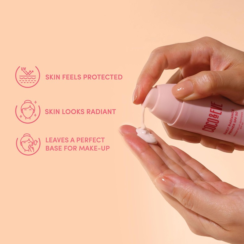 Coco & Eve Daily Radiance Primer SPF50 Sunscreen. Tinted Primer with SPF 50 for Sunscreen Protection Against UVA UVB. Antioxidants, Niacinamide for Radiant Skin and Healthy Glow. (50 ml)