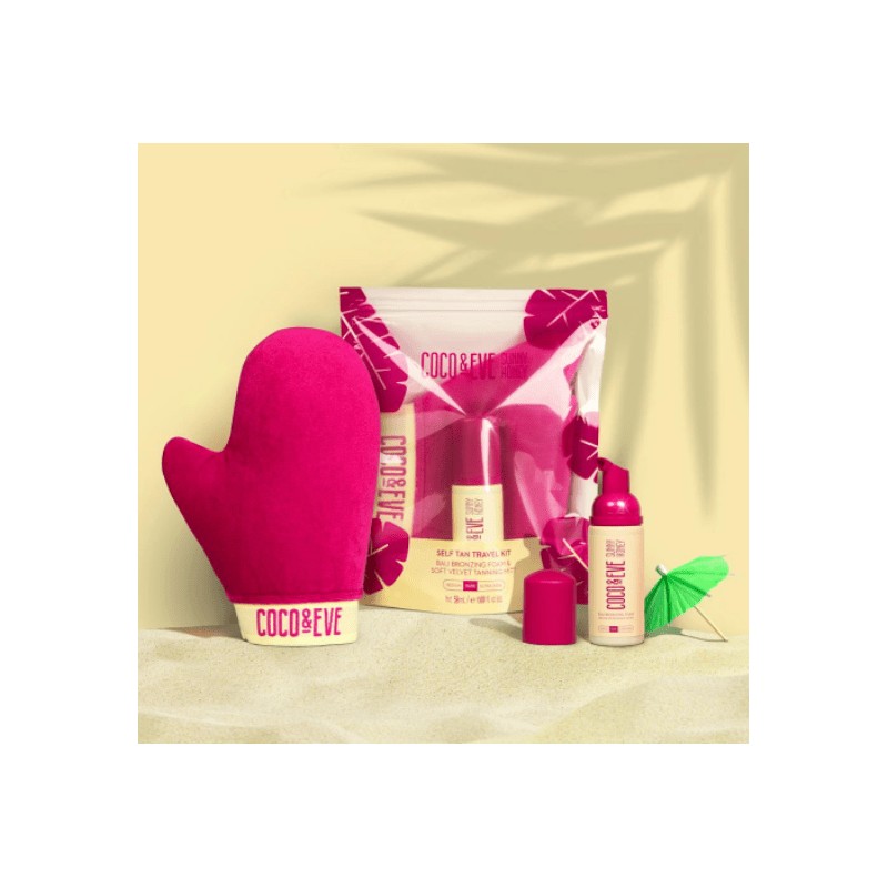 The Coco & Eve Self Tan Travel Kit - Dark includes a 50ml bottle of bestselling Bali Bronzing Foam and a hypoallergenic soft velvet self tan mitt, perfect for all your trips.