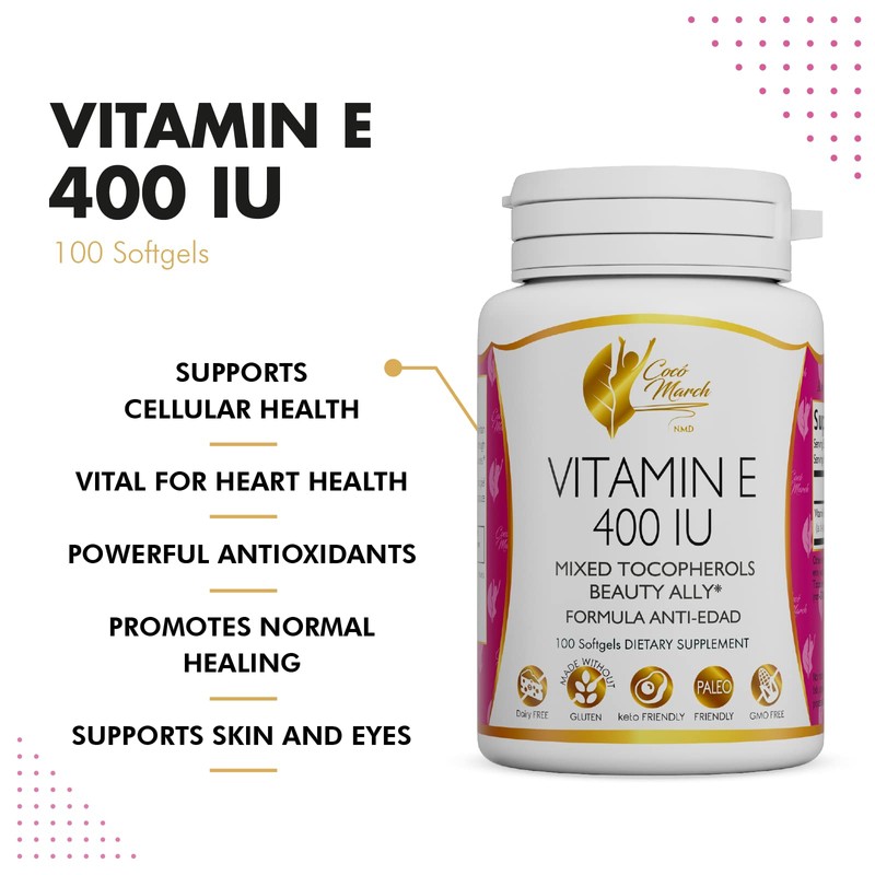 Cocó March N.M.D Natural Vitamin E 400 IU-Mixed Tocopherols, Beauty Ally, 3 Month Supply - Gluten Free, Paleo Friendly, Dairy Free, Keto Friendly, GMO Free, 100 Softgels