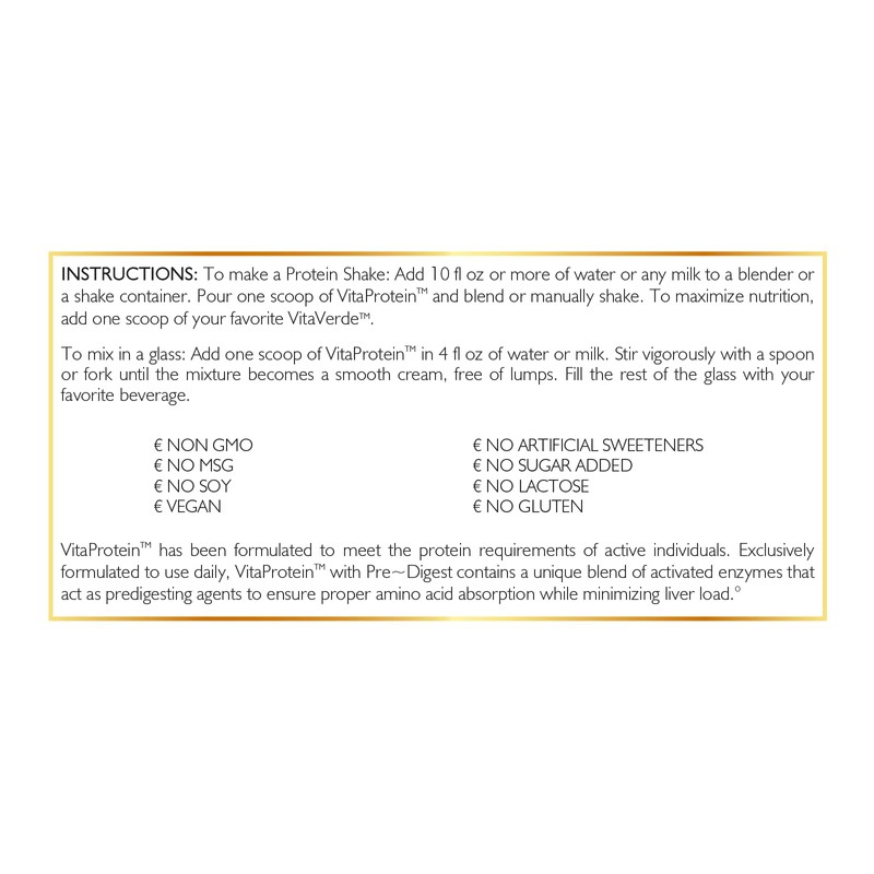 VitaProtein is designed for active men and women and is the perfect choice for on-the-go professionals, athletes, students, competitors, and anyone needing a quick-dissolving powder for making delicious milkshakes to add to a healthy lifestyle. In order for the body to function properly, it needs high concentration levels of nutrients and protein. Protein is also necessary for endurance and strength in the body. Amino acids found in proteins aid your body in recovering from injuries and building strength. An extra source of protein in addition to the digestive enzymes is important for sick people, vegans, vegetarians, the elderly, or people who are extremely active. Protein powder combined with digestive enzymes is a delicously convenient way to attain that right balance. Essentially, this combination may be just what you need to support your body's ability to recover because keeping your body strong requires energy. Since the body is continually feeding on itself to properly use stored energy, then supplementing with something that maximizes this activity might prove to be a smart decision.