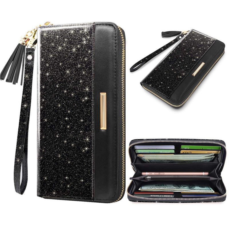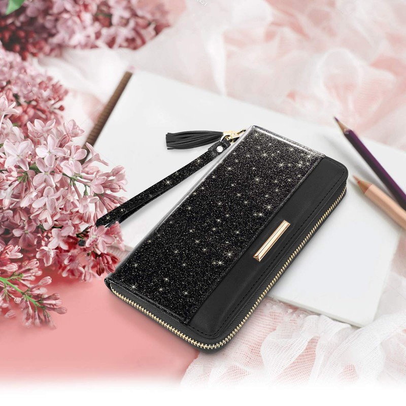 Coco Rossi Women Wallets Multi Card Case Wallet Clutch Wallet Card Holder Organizer Ladies Purse Glitter Tassel Wrist strap Purse,Black Glitter