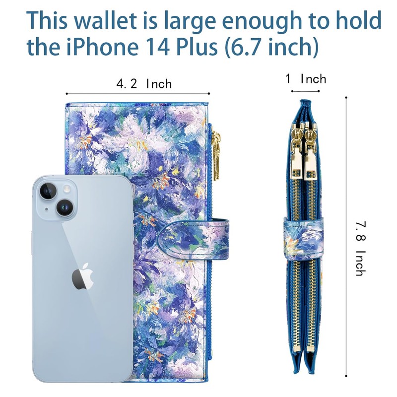 Coco Rossi Womens RFID Blocking Large Capacity Wallet Multi Card Organizer Bifold Wallet for Women with Zipper Pocket, Blue Flowers, Large, Classic
