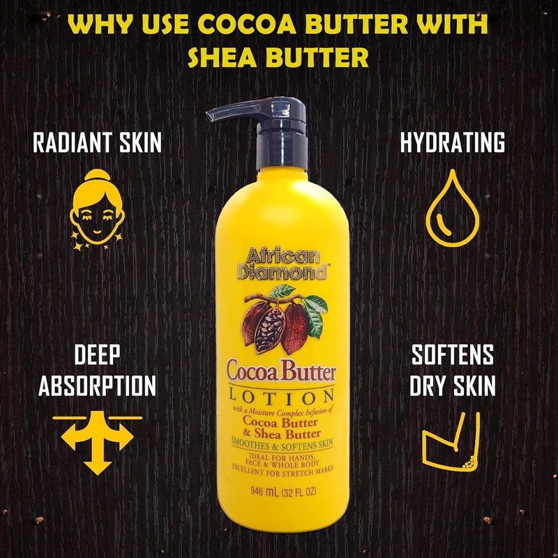 Cocoa Butter & Shea Butter Lotion by African Diamond. Includes a bonus 3-pack of 10ml lotions in assorted varieties. (946 ml, Cocoa Butter & Shea Butter)