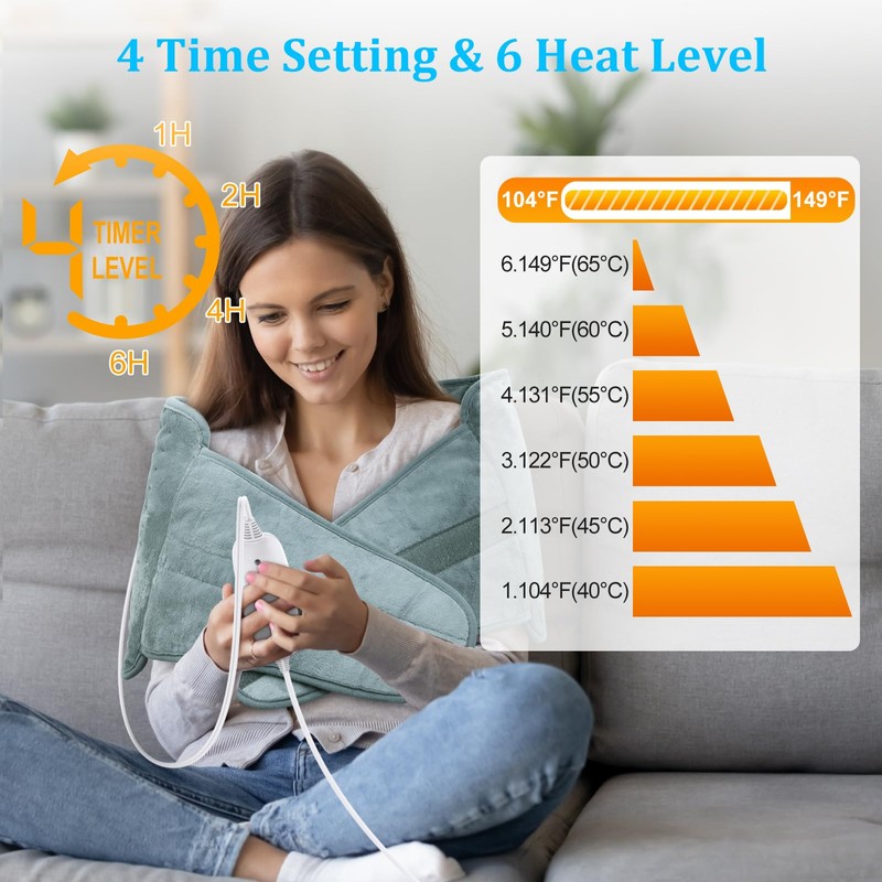 • Max 6-Hour Auto Off + 6 Heat LevelEasy-to-use auto off controller, which enable to set auto shut off 1 hr/2 hrs/4 hrs/6 hrs, extend the using time while keep your safety. Heat can be adjust from 104H to 149H, hot enough for pain relief and ease muscle tension.