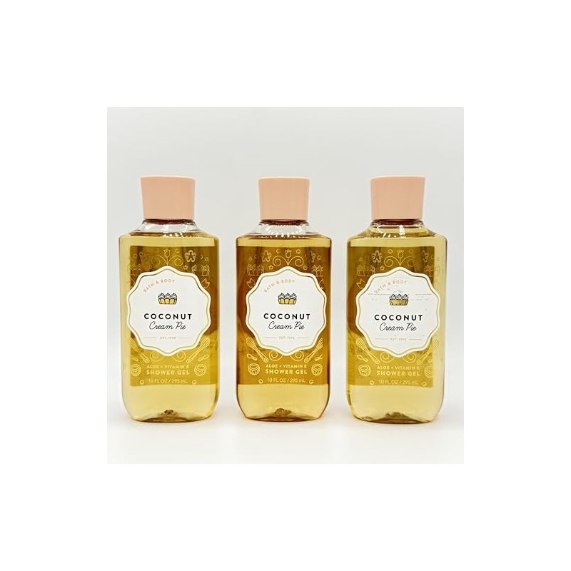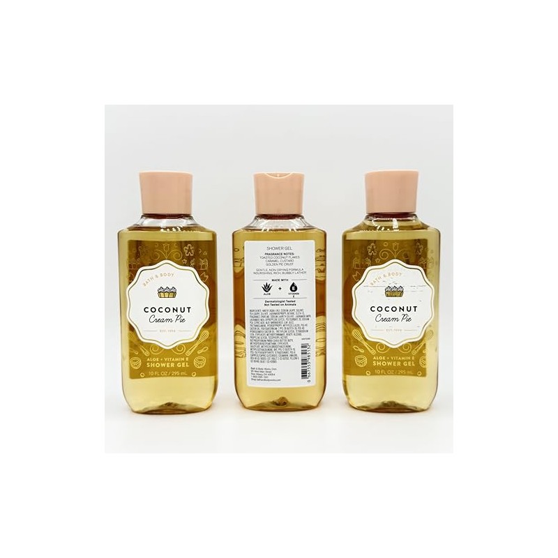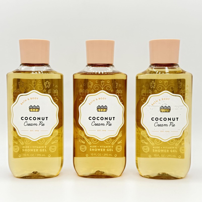 Coconut Cream Pie 3-Piece Bath & Body Bundle | Set of Three 10-Ounce Shower Gel Bottles. Scent notes: Toasted Coconut Flakes, Caramel Custard, Golden Pie Crust. Contains: Aloe, Vitamin E. Cleanses and nourishes the skin leaving a wonderful scent.