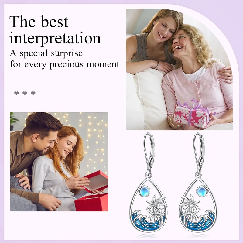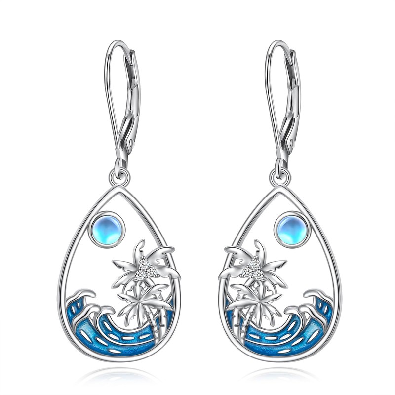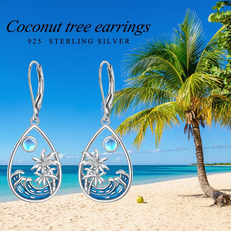 Coconut Palm Tree Ocean Waves Teardrop Moonstone Earrings for Women Natural Jelwery 925 Sterling Silver Lever-Back Dangle Drop Earrings Gifts for Natural Lovers