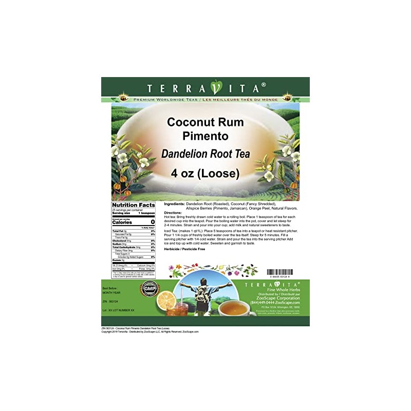 - Our Coconut Rum Pimento Dandelion Root tea is a delicious naturally flavored Dandelion Root coffee substitute with Coconut, Allspice Berries (Pimento, Jamaican) and Orange Peel that you will enjoy relaxing with anytime! The natural and caffeine-free Coconut Rum Pimento taste is delicious! - Ingredients: Dandelion Root, Coconut, Allspice Berries (Pimento, Jamaican), Orange Peel and Natural Coconut Rum Pimento Flavor.