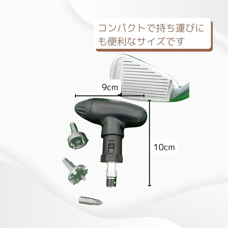 Tool to replace golf shoe spikes. 3 types of accessories: Comes with 3 types of attachments to accommodate all types of spikes. Practical: The rounded grip makes it easy to grip and apply force. Accessories can be stored inside so there is no need to worry about losing them. Size / Specifications: Size: 3.9 x 3.5 x 1.2 inches (10 x 9 x 3 cm); Material: ABS and steel, Color: Black.