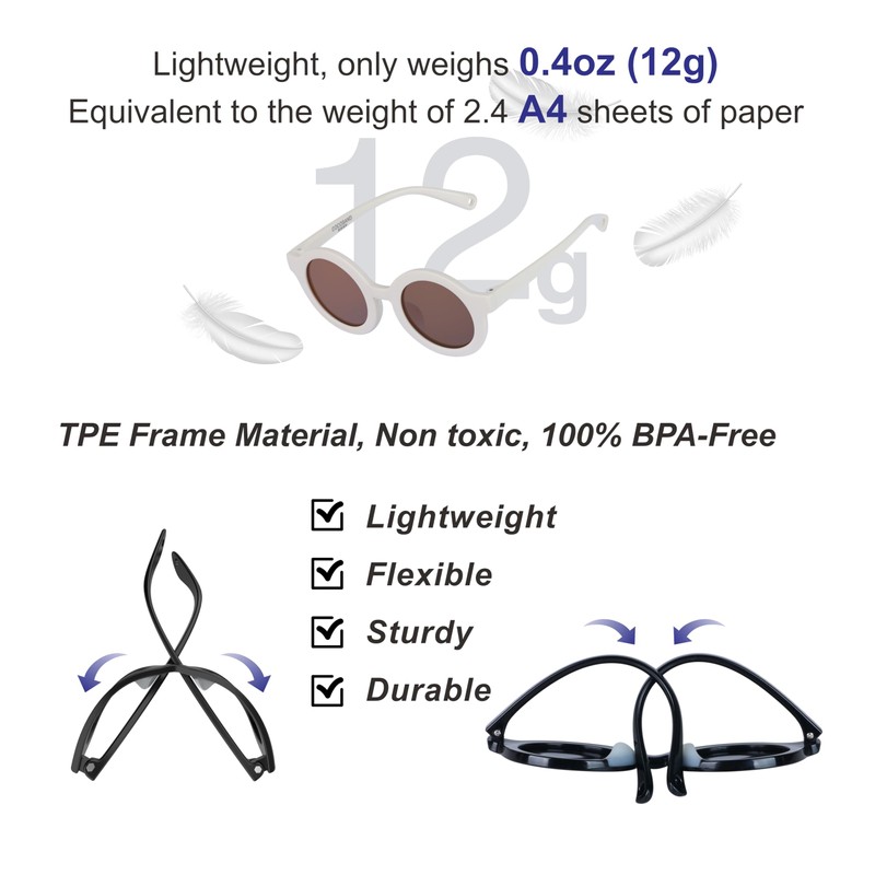 - 【Reliable Material & Outstanding Design】Refined with Thermoplastic Elastomer (TPE) material, which is friendly to baby's skin. The toddler sunglasses are designed with soft and elastic frames, not easy to deform and fit the baby's face to improve wearing comfort. Adjustable elastic headband is convenient to adjust freely according to baby's head circumference, not easy to slip off, and also easy to fix and remove
