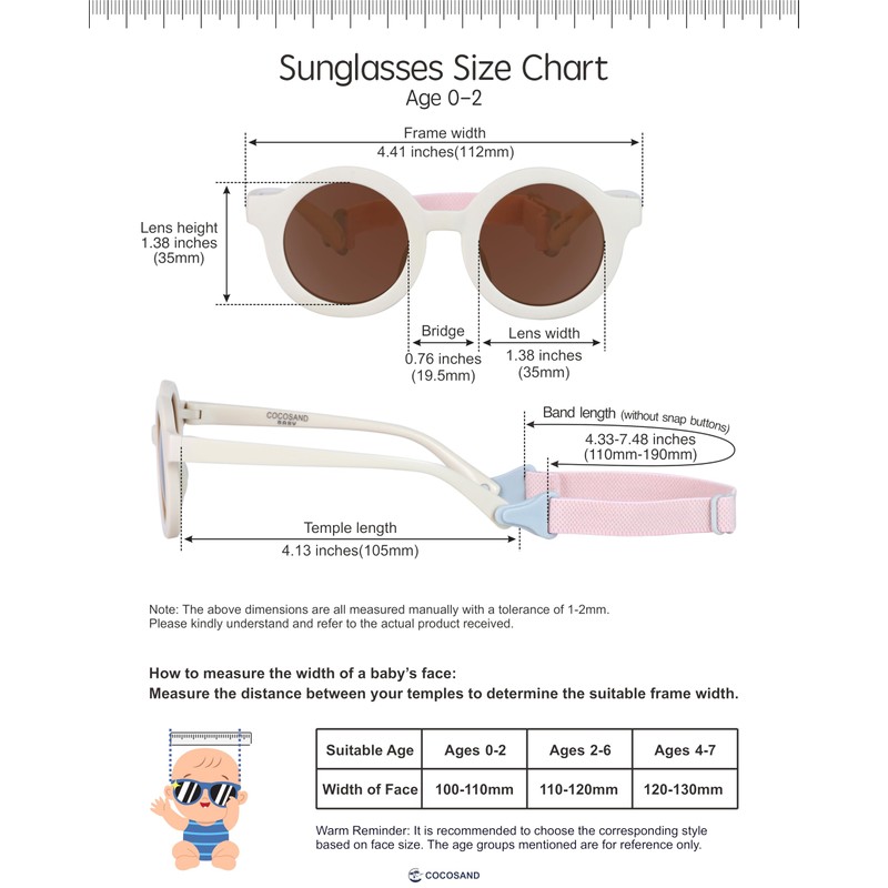 - 【Professional Standard】COCOSAND as a professional Sunglasses manufacturer, these infant sunglasses with exclusive patented technology is ideal for newborn babies, toddlers, baby girls and baby boys from 0-2 years old, suitable for babies with head circumference up to 18.9 inches (please refer to the head circumference sizing chart before purchasing), and available in a wide range of colors to choose from: Black, Pink, White, Purple, Blue