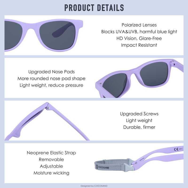 COCOSAND Toddler Baby Sunglasses with Strap Polarized Flexible Square Frame UV400 Protection for Kids Girl Boy Age 2-6, Purple