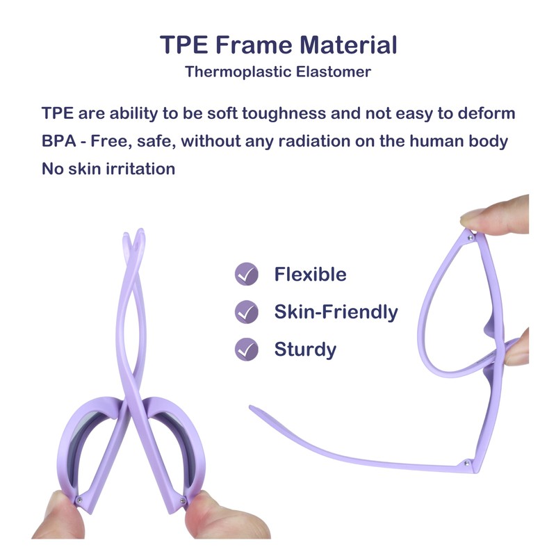 - TPE, non toxic, BPA-Free Frame Material. Flexible and sturdy, safe for babies kids. Compliant with FDA food safety standards, chew and bite resistant. Lightweight to wear without squeezing your ears or nose.