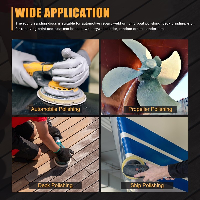 The Round sanding discs is suitable for automotive repair, weld grinding, boat polishing, deck grinding, etc., for removing paint and rust; can be used with drywall sander, random orbital sander, etc.