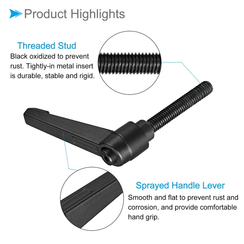 --- Lightweight zinc alloy handle provides superior strength, corrosion resistance and long service life. The surface of the handle lever is sprayed smooth and flat to prevent rust and corrosion and provide a comfortable hand grip. External threaded studs are black oxidized to prevent rust Solid carbon steel insert handle is adjustable, durable, stable and rigid.
