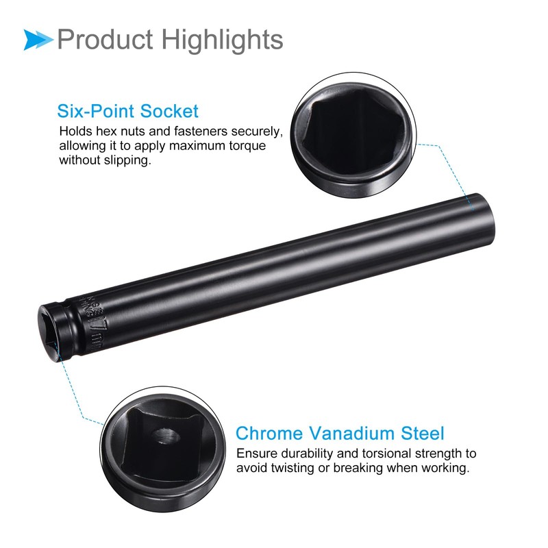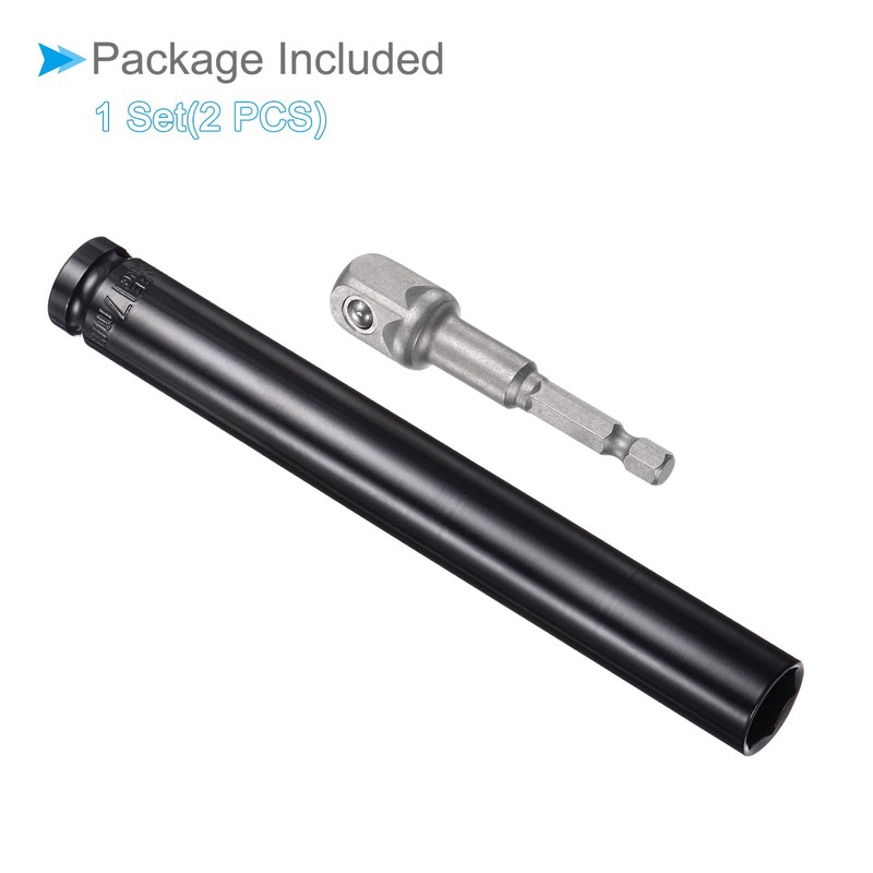 - ★ Deep Socket Size --- Socket Size: 17mm, Drive Size: 1/2-inch, Total Length: 200mm / 8-inch; Socket Adapter Hex Shank Size: 1/4-inch; Total Length: 65mm / 2.5-inch.