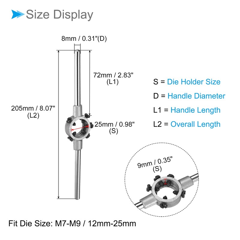 - ★ Die Stock Size --- Fit die size: M7-M9 / 12mm-25mm (outside diameter); die holder size: 25mm x 9mm / 0.98" x 0.35" (D*H); overall length: 205mm / 8.07"