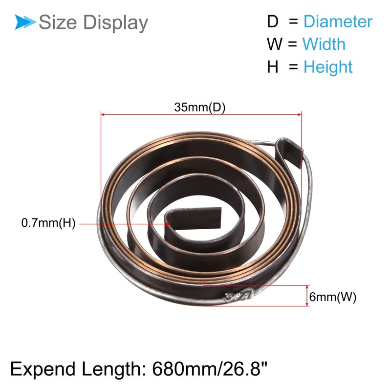 - ★ Drill Press Return Spring Size --- 680mm/26.8" in Expand Length, The total size of the drill press spring is 35x6x0.7mm(ODxWxT).