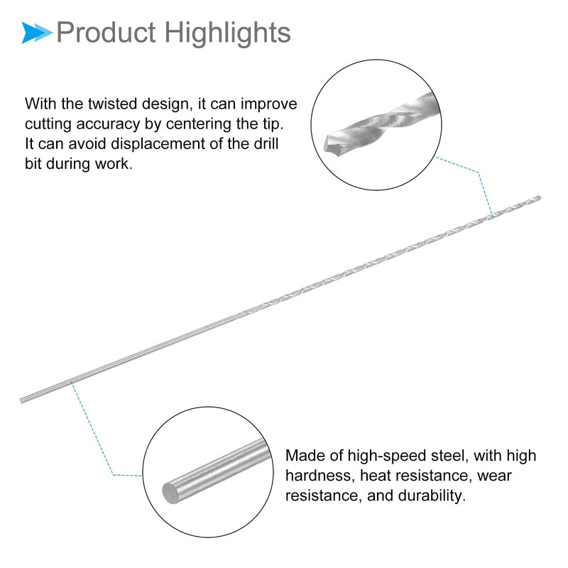CoCud Extra Long Twist Drill Bit, 0.06 inch (1.5 mm) Drill Diameter, 6.3 inches (160 mm), Total Length, High Speed Steel, Twist Drill Bit for Copper, Metal, Wood, Aluminum, 2 Pieces