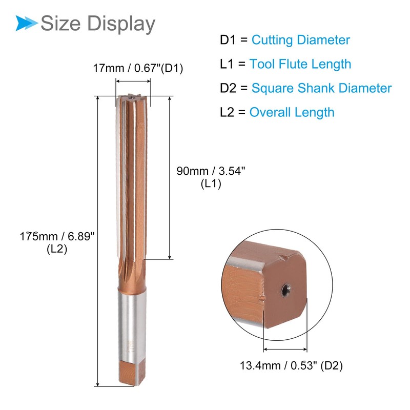 - ★ Hand reamer size --- The hand reamer has a cutting diameter of 17 mm / 0.67 inches and a total length of 175 mm / 6.89 inches.