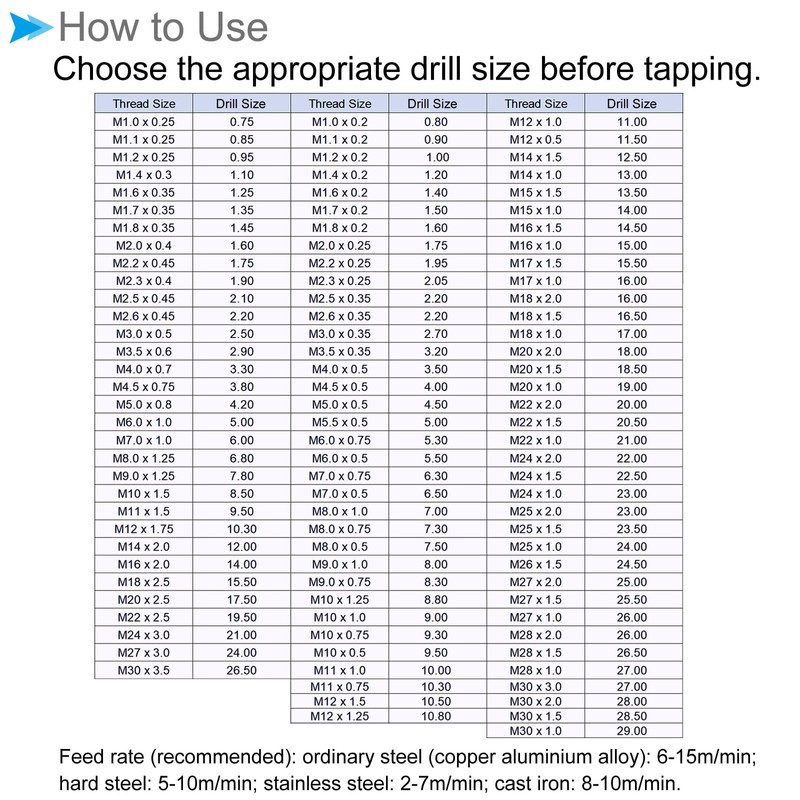 --- Alloy tool steel (9SiCr) screw taps have high hardness, high torque, good toughness and wear-resistance, good for general purpose applications. The surface of the tap has a reddish-brown coating, which belongs to the normal processing technology. ( it is not rusty.) Tapping oil is lubrication, cooling and anti-sticking. Add appropriate tapping oil for higher quality internal threads and more durable taps. The tapping depth should not exceed 1.5 times the diameter (eg: diameter=6mm (M6), maximum tapping depth=9mm). Drill holes with a twist drill before tapping, and the tapping angle should be 90 degrees vertical and stable.