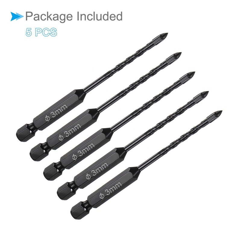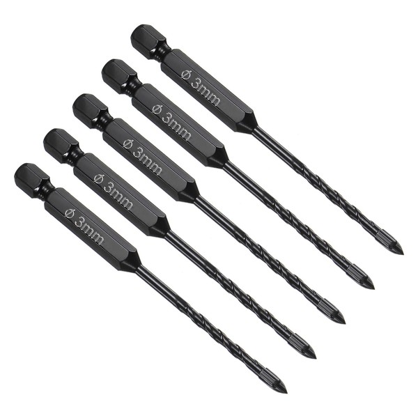 CoCud Masonry Drill Bit, 3mm Cutting Dia 89mm Length 1/4" Hex Shank Carbide Cross Tip Concrete Drill Bit Set Black - (Applications: for Wood Glass Brick Cement), 5-Pieces
