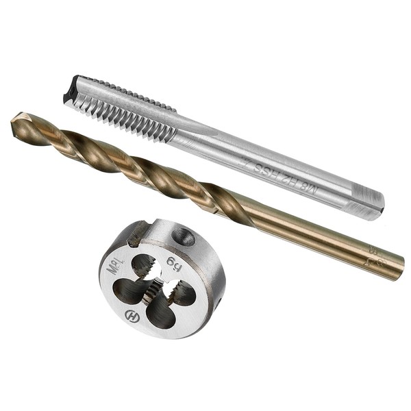 - ★ Tap and Die and Drill Bit Set Size --- Tap & Die Thread Size: M8 x 1.25 (Left Hand); Tap Accuracy: H2; Tap Total Length: 71mm / 2.8"; Die Outside Diameter: 25mm / 0.98"; Die Thickness: 9mm / 0.35". Drill Bit Diameter: 6.8mm / 0.27"; * Overall Length: 107mm / 4.21"