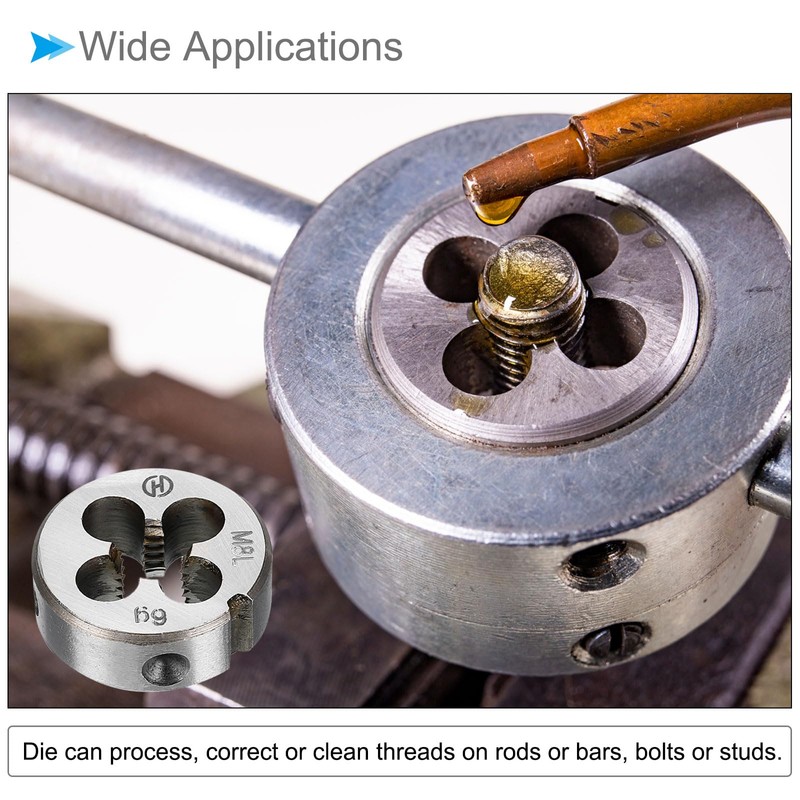 --- The tap and die and drill bit set can repair or create threads on stainless steel, aluminum alloy, cast iron, copper, iron, aluminum, plastic. The thread tap is used for tapping through holes or shallow blind holes, such as threads in nuts, threaded inserts, pipes. The metric round die can process, correct or clean threads on rods or bars, bolts or studs.